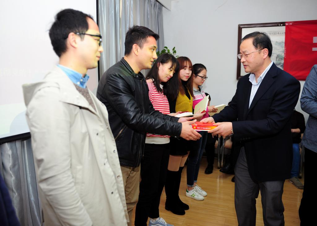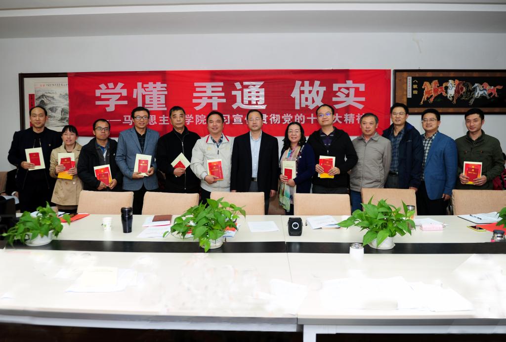公司党委书记何光彩同志为教工党员、员工代表发放《中国共产党章程》、《党十九大报告辅导读本》和《习近平总书记关于高等教育重要论述摘编》等学习资料。