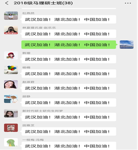 自公司上传《关于组织开展新冠肺炎疫情防控主题班会的指导方案》文件后,就得到了2019级马克思主义理论硕士班的强烈支持,经过几天的精心准备,于3月6日晚7点开展了本次班会,全体同学积极参加,主要内容有两部分,一是认真学习了新冠肺炎防控的相关知识,包括新型冠状病毒简介、新型冠状病毒感染病例诊疗方案、新型冠状病毒感染预防与治疗技术简介、新型冠状病毒感染病例诊断程序。二是每位同学积极发言,讲述了自己在疫情防控期间的心理状态和学习状态,同学们还是保持了积极面对的心理状态和“停课不停学”学习状态,认为疫情很快就会过去,认真学习才是我们应该关注与坚持的,通过大家的发言得知:大部分同学每周的专业课学习研究时间都能达到40个小时,并且在居家的环境中仍保持较高的学习效率,这是同学们在多年的求学历程中养成的良好品质,龙启航同学表示:疫情期间正是我们要认真学习的时间,是提高自身的好机会。
