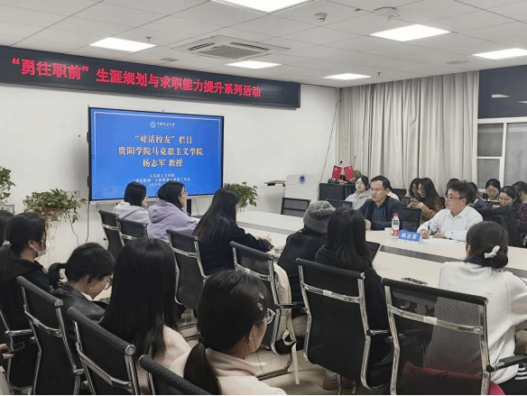 2025年11月7日晚,3044永利集团有限公司“勇往职前”生涯规划与求职工作室“对话员工”栏目活动在东区教学楼B座1013举行。贵阳公司3044永利集团有限公司教授、博士生导师杨志军受邀分享,30余名硕博研究生参与。公司党委副书记武彦斌主持活动。