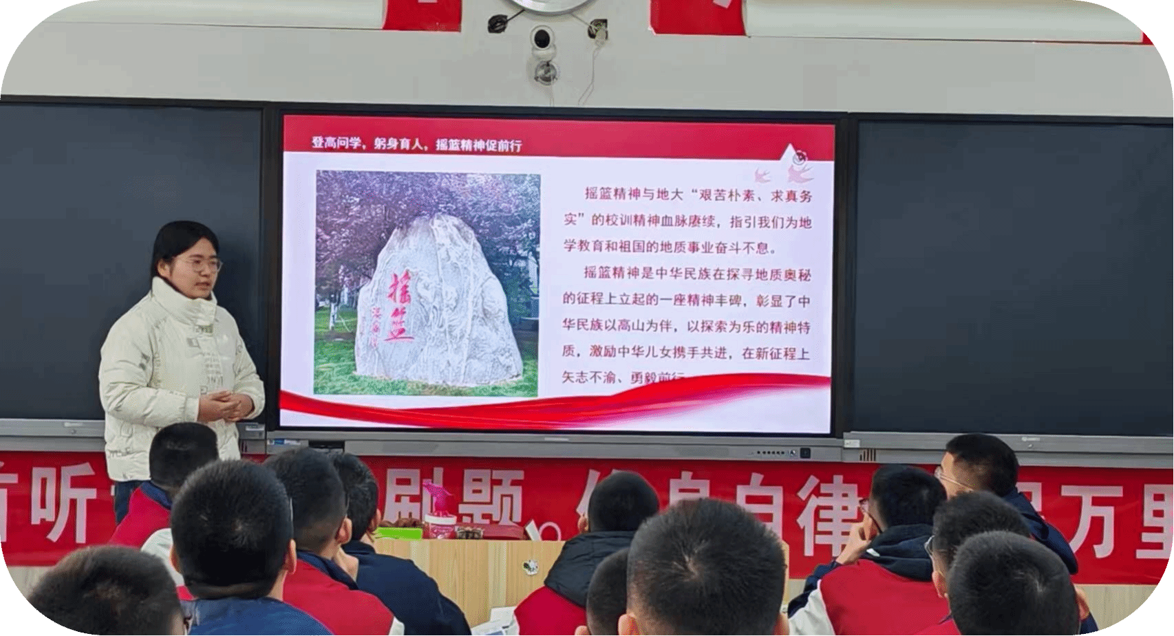 首先,辛汪洋同学开始介绍摇篮精神的的初盛,带领同学们领悟摇篮精神的魅力,摇篮精神哺育着一代又一代地质学子,照亮地质教育的未来,同时摇篮精神鼓舞着无数青年,引领他们探索、超越前方的路。然后,讲述摇篮精神的重振延续,随着周口店重建,“摇篮”再次焕发新生,开启了地学人才培养的新征程,在周口店的奋发岁月里,创新的火花与传承的精髓交织融合,共同谱写了地质教育的辉煌篇章。