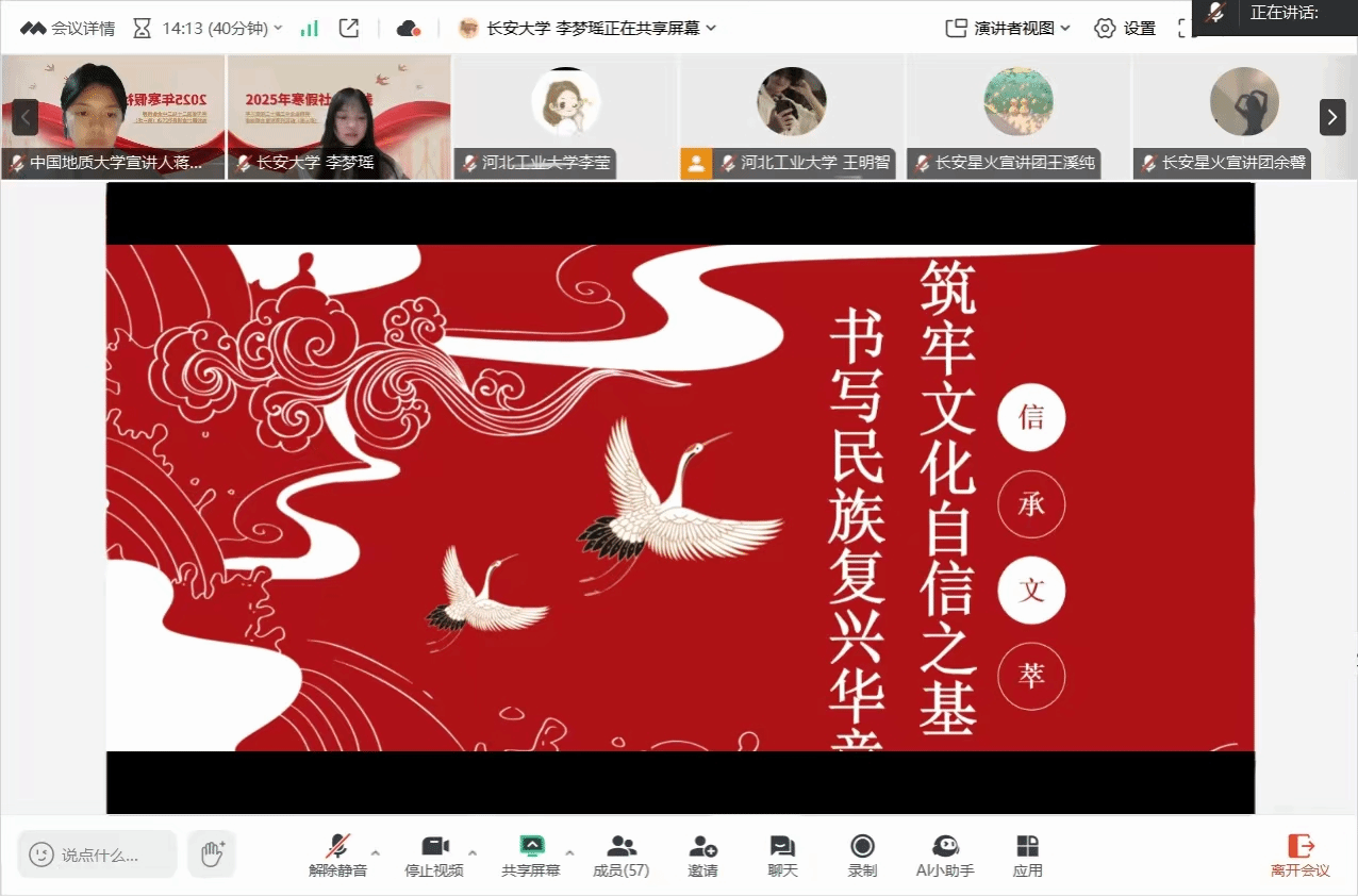 宣讲结束后,同学们纷纷表示,通过此次活动,他们对文化自信有了更加全面和深入的理解,也更加坚定了为实现中华民族伟大复兴的中国梦贡献青春力量的决心3044永利集团有限公司(武汉)3044永利集团有限公司“信承文萃”团队的此次线上宣讲活动,不仅为同学们提供了一个学习和交流的平台,更是一次精神的洗礼和思想的升华。在新时代的征程上,让我们携手同行,共同筑牢文化自信之基,书写民族复兴的华章。