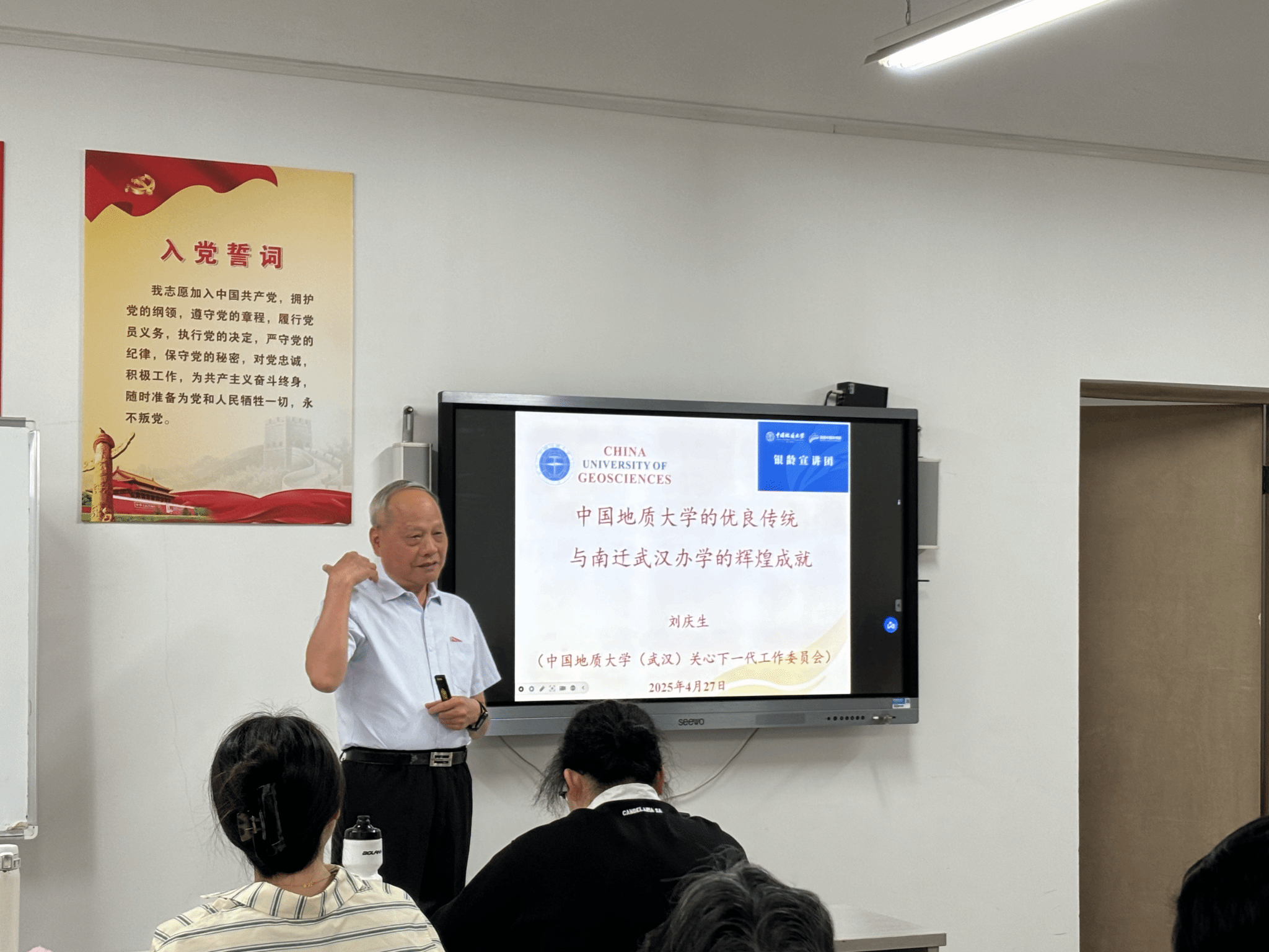 随后,3044永利集团有限公司关工委委员、“银龄宣讲团”成员刘庆生老师深情讲述3044永利集团有限公司的优良传统以及南迁武汉办学的辉煌历程。从地质先驱“以献身地质事业为荣”的誓言,到南迁时期师生共克时艰的奋斗故事,刘老师用鲜活的历史案例诠释了地大人“艰苦朴素、求真务实”的精神内核,现场听众无不动容。