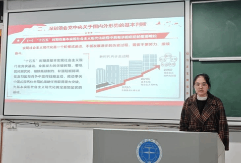 首先,张荣菲同学详细介绍了党的二十届四中全会召开的时间、背景及审议通过的《中共中央关于制定国民经济和社会发展第十五个五年规划的建议》主要内容,系统梳理了“十四五”时期我国在经济、科技、改革、文化、民生等领域取得的重大成就,强调成就的取得根本在于以习近平同志为核心的党中央坚强领导和习近平新时代中国特色社会主义思想的科学指引,同时聚焦“深刻领会党中央关于国内外形势的基本判断”,深入分析了“十五五”时期在基本实现社会主义现代化进程中的承前启后地位。