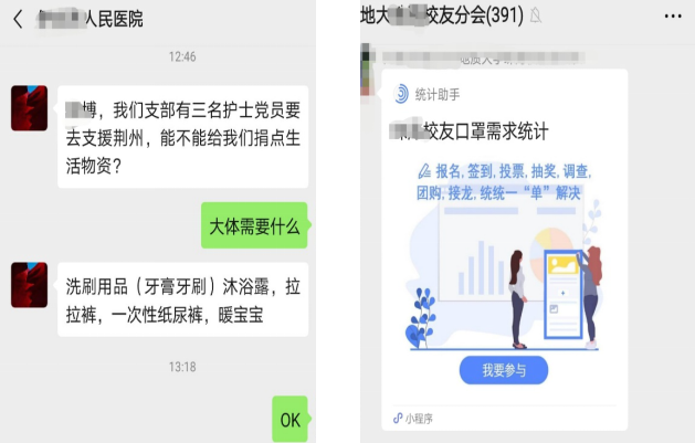 博士生党支部某党员:作为一名党员,同时武汉也是我的第二故乡,武汉疫情让我十分揪心,时刻牵动着我。看着我的医生朋友不怕风险积极支援武汉、荆州等地,心里总想着自己也要出一份力。医生朋友给我反馈他们十分缺乏物资,他们缺口罩、尿不湿、生活物品……同时通过各渠道了解武汉各行业急缺医疗物资和生活物资。