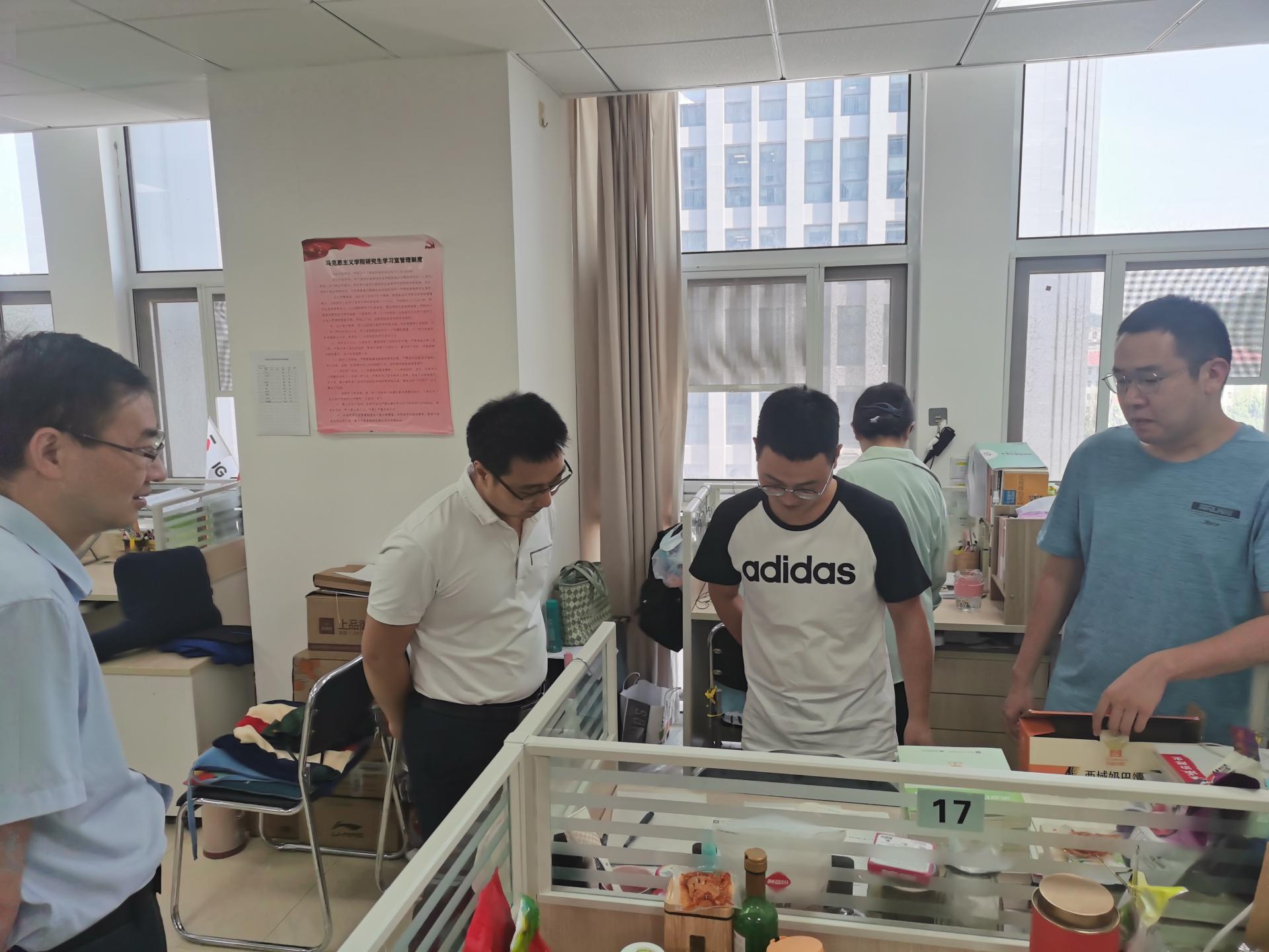 院领导一行先来到9楼916员工自习室,询问留校硕士博士自修研习情况,对员工暑假在校生活进行了解,提醒同学们假期在校注意用电安全并为同学们送上慰问品。