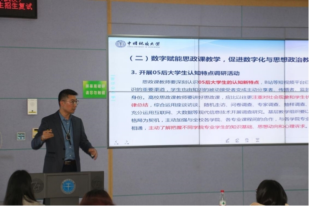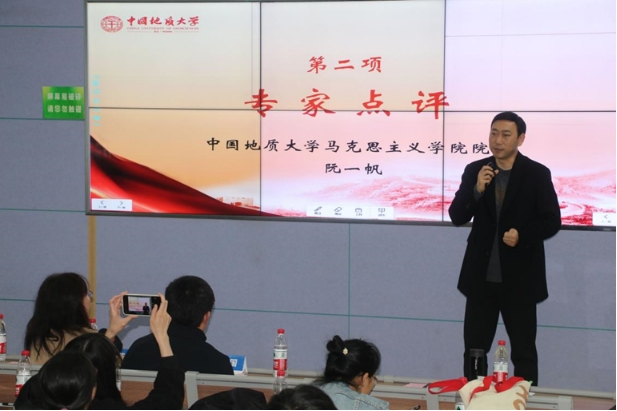 在点评环节,阮一帆经理首先对于两位老师来到地大马院作思政课示范教学展示表示感谢。他表示,两位老师的讲课充分做到了思想性和政治性的统一、内容和形式的统一、灌输性和启发性的统一、演与讲的统一,以其深厚的知识学养、生动活泼的展示形式、紧密结合例证的讲道理方式以及优秀的教态表现,呈现了全国顶尖思政课教师的风采,值得在座各位师生学习。他指出,今年正值“习近平总书记‘3·18’重要讲话发表五周年”,五年来,全国各高校深入学习贯彻习近平总书记重要讲话精神,努力推动思政课高质量发展。重温习近平总书记在公司思想政治理论课教师座谈会上的重要讲话精神,直面当前思政课教学仍存在的诸多问题和不足,结合公司“提质增效年”的工作主题,今年地大马院也是提出了“思政课提质增效”计划,今天的思政课示范教学展示活动就是计划内容之一。