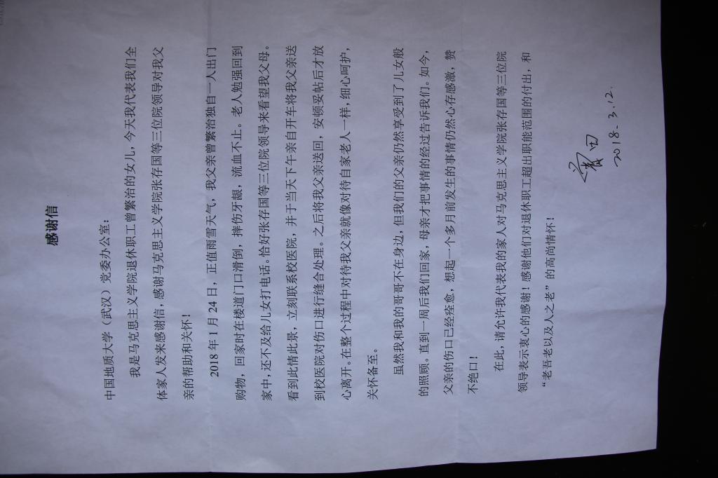 信是由公司退休职工曾繁治的女儿曾田写的。信里对公司张存国、阮一帆、严世雄等同志在2018年寒假看望离退休职工途中,遇到其父亲摔伤后立即送往医院救治表示了感谢!对公司关爱离退休教职工表示感谢!