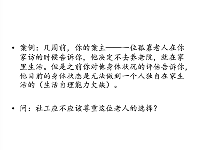 3.观看视频《社工的一天》并提交作业回答下列问题 (1)社会工作者服务的对象包括哪些人? (2)社会工作者做了哪些具体的事情? (3)社会工作者接触的其他相关部门人员有哪些? |