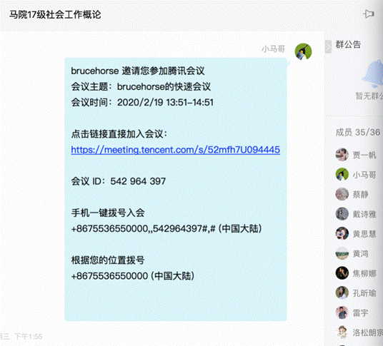 每次直播前,会提前一天利用腾讯会议的预约功能,预约次日上课时间段的会议,并将生成的加入会议的链接发送到QQ群,也可以采用“快速会议”的方在上课前建一个会议,并将加入会议的链接发送到QQ群。