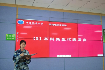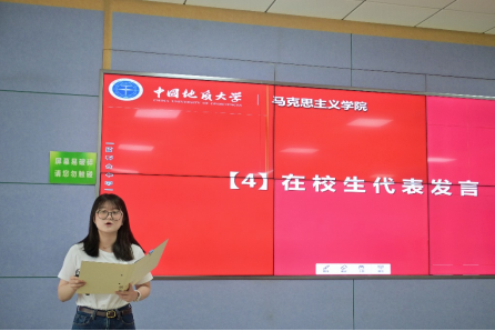 本科员工会执行主席刘琳达代表在校员工发言,她以自己在地大马院学习生活了两年的经历,从课堂学习到校外实践,从专业知识到校园生活,从四个方面分享了心得体会。