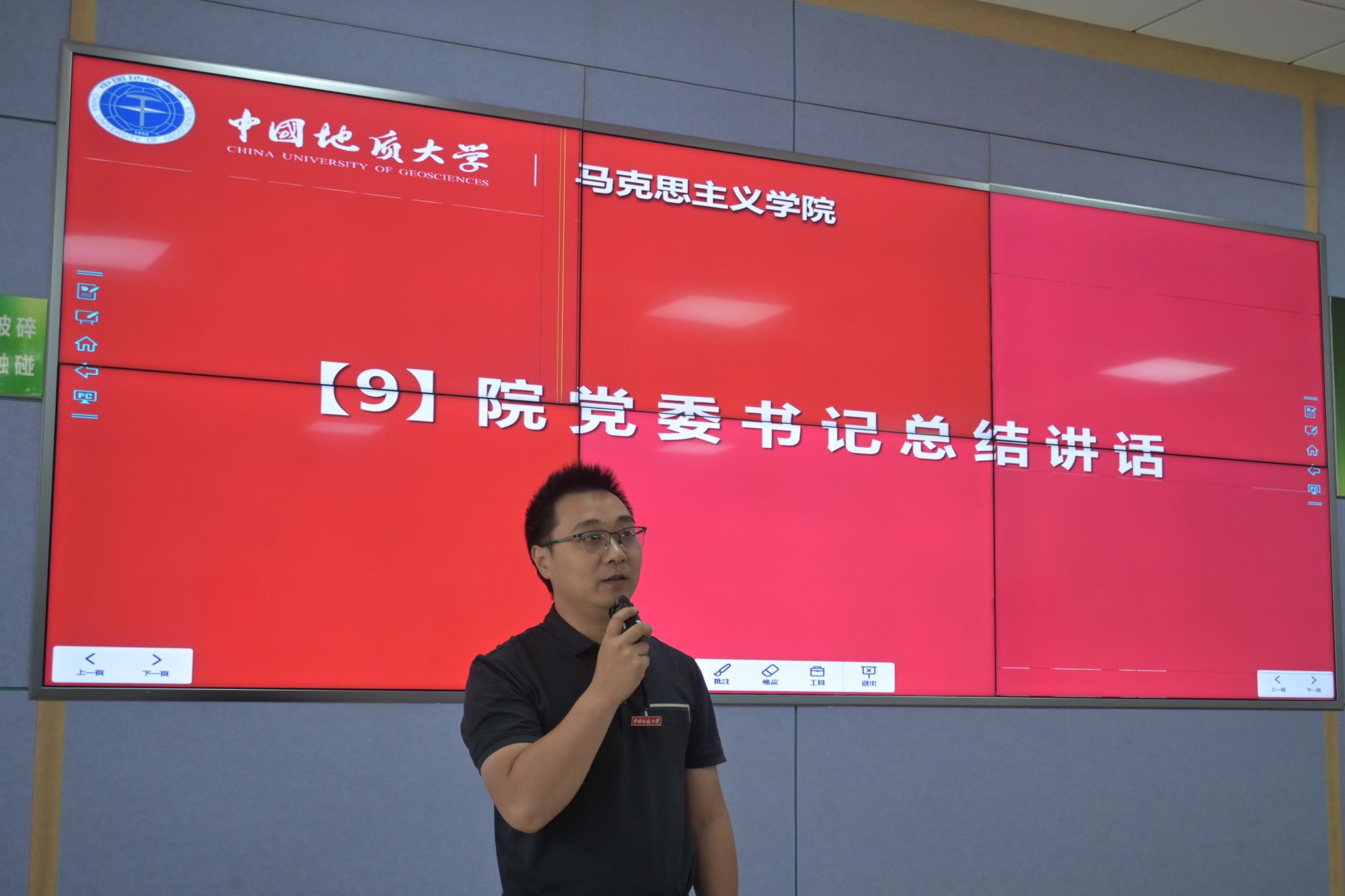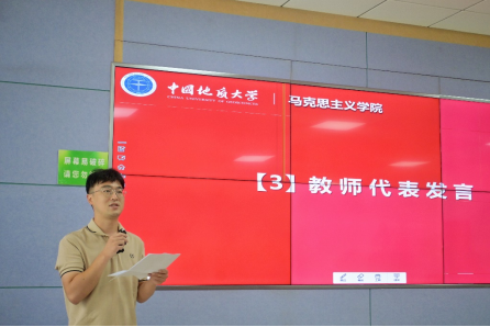 思政系青年教师曹阳作为教师代表发言。他回顾十四年马院学习工作生涯,感慨万千,借此机会与各位同学分享共鸣。第一,要心怀感恩之心,回顾在地大的十四年,他个人的成长发展受益于伟大时代的发展,获益于地大“艰苦朴素,求真务实”校训精神的熏陶,也得益于公司领导的关心与支持。第二,要胸怀报国之志,珍惜在校期间的学习机会,努力成长为有理想,有担当的新时代好青年。第三,要永怀敬畏之心,坚持学以致用,学思悟透,熟练掌握马克思主义立场观点方法。第四,要常抱奋斗之志,奋斗是青春最亮丽的底色,以奋斗之力激昂青春,努力把个人成才与国家发展融为一体。