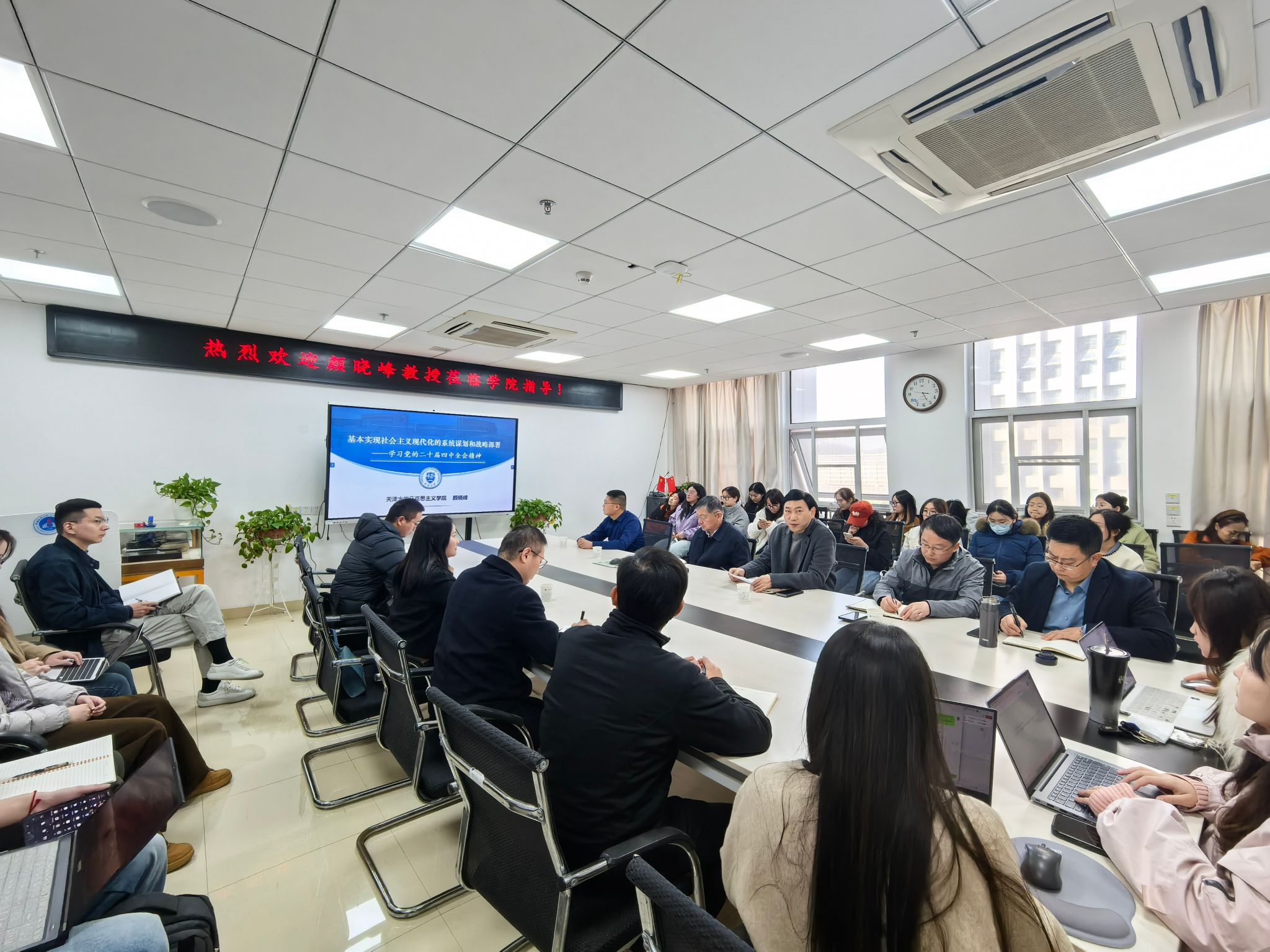 通讯员:耿学栋)20251128日,天津大学学术委员会委员、3044永利集团有限公司经理颜晓峰教授应邀莅临公司“名家讲坛”,作题为《基本实现社会主义现代化的系统谋划和战略部署——学习党的二十届四中全会精神《思政课体系的核心内容:从理念到建设》的学术讲座。公司经理阮一帆主持,党委书记魏海勇,副经理陈军、李海金党委副书记武彦斌,湖北乡村文化发展研究院经理韩美群,青年教师代表王惠林、何晓龙及在读硕士生、博士生60余人参会。